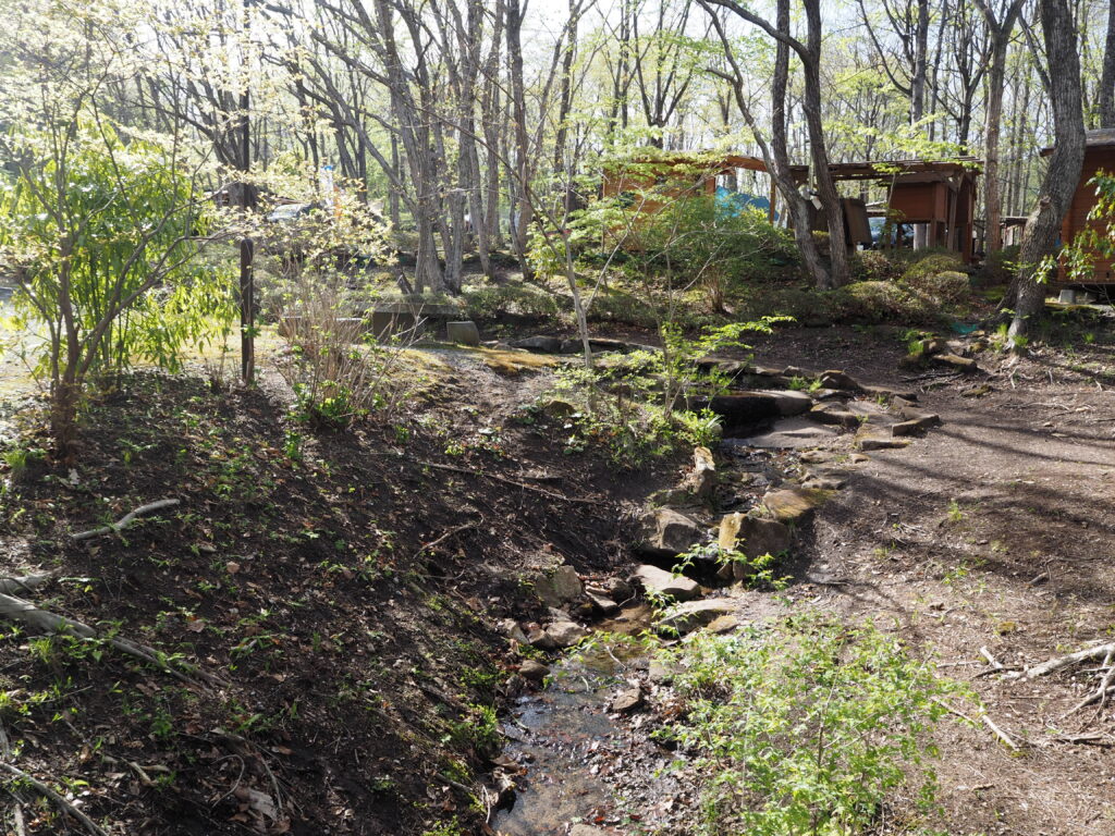 この感じで手前に焚火スペースを作れる程度の広さ。